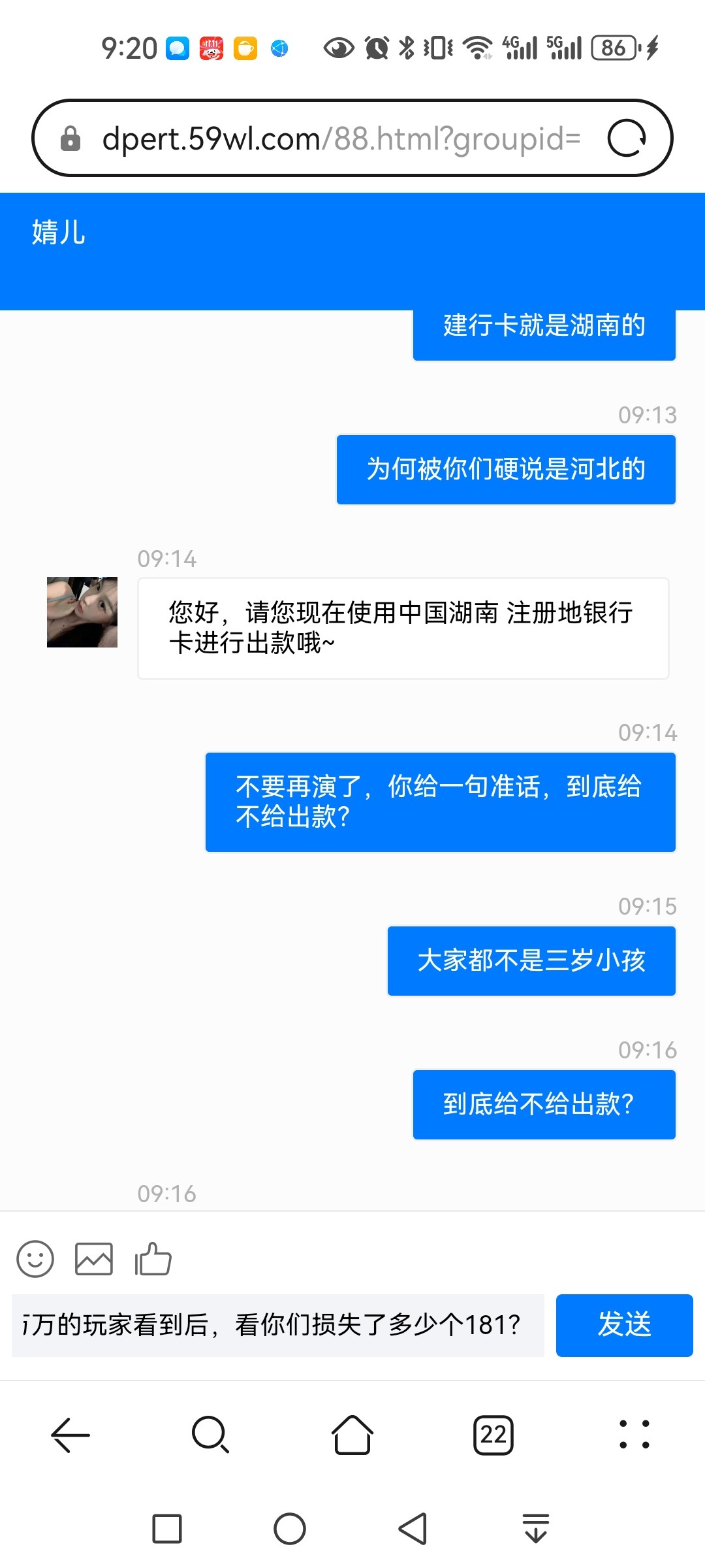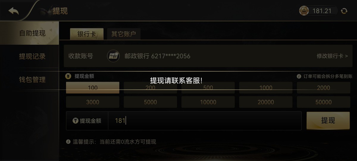这两个都是一个公司的,我充值141去玩,提现181,一次说钱包维护,二次又说玩注册地的银行卡,三次换成当地银行卡后被他们无耻都硬说成是外地的,我提供了卡片注册地还是顺外地的,摆明了就是不给出,于是我边找客服再次提现,还是被拒,最后我说去各大白菜网曝光他们,,于是叫我再换卡才给出款,这样的垃圾平台千万不要掉进去了,也不能让他们成活下去