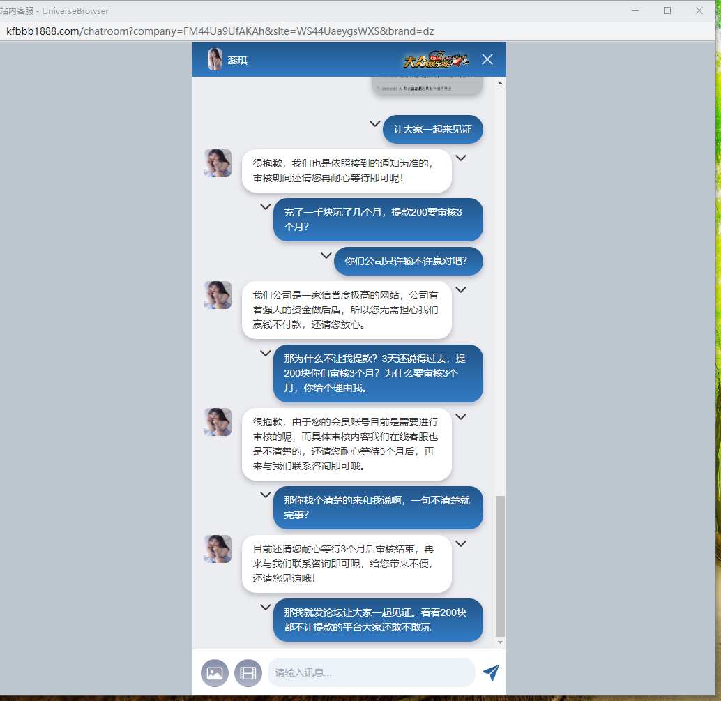 大众娱乐城,赢了不让提款,说审核3个月,3个月后联系又说审核3个月。
