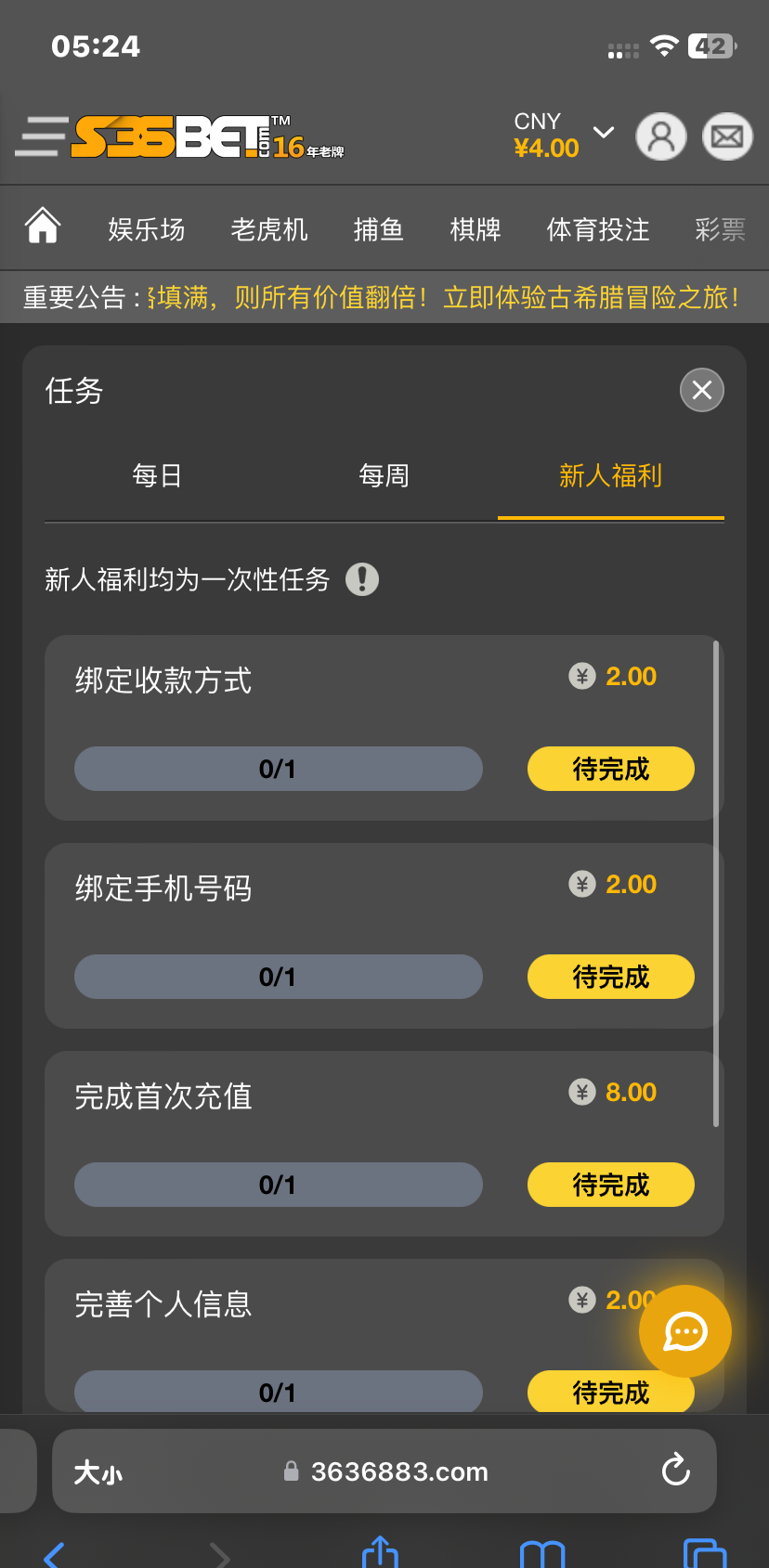 注册-首页横幅-限时福利点进去,新人任务全部完善就OK了,出款自测!网址:https://www.3636883.com/zh-CN/rewards/tasks