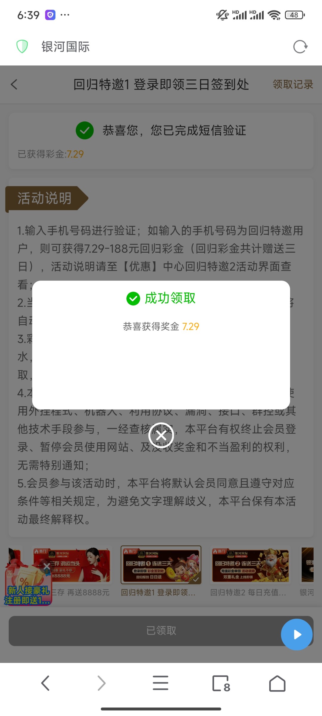 网址729913.com回归验证手机号领取三天彩金 一天领一次