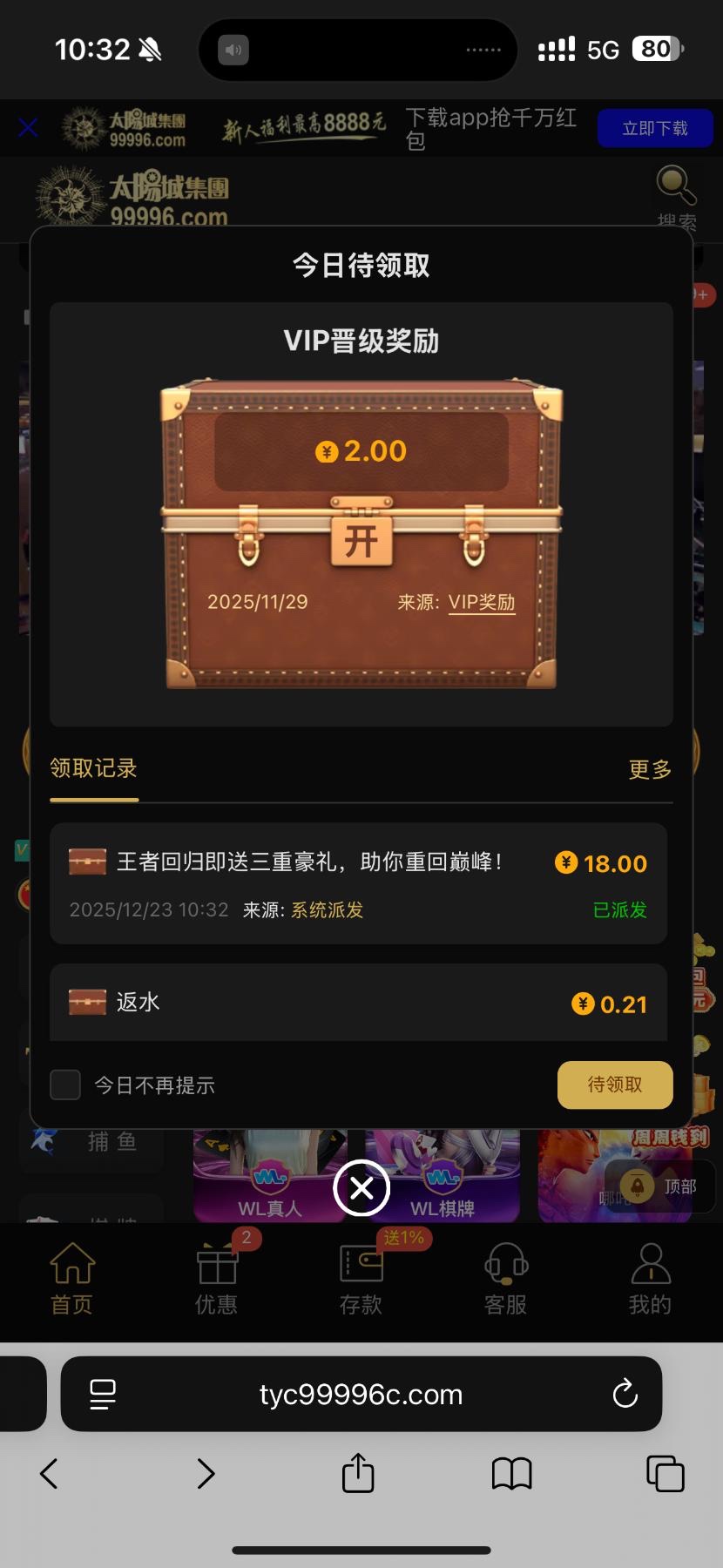 99996太阳城回馈18,登陆就有,收到微信去的。狗台应该人人都注册过。可以上号碰一碰,白嫖勿充值