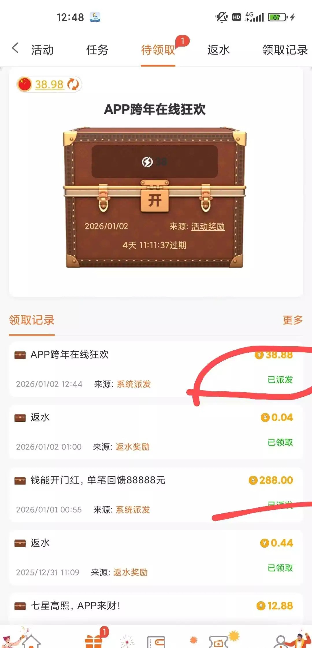 跨年夜彩金,昨天app登录在线的应该都有,我领了38.88,几个月没充值了,借呗也逾期